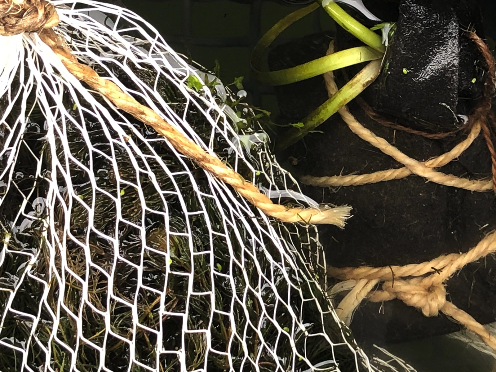 Kees Koot (Stichting Waterplant) en Sara Boschuiver (Waterbaten) adviseren, helpen met de aanplant en leveren waterplanten voor deze mooie uitdaging. Welke planten zijn robuust en veerkrachtig genoeg om de ongunstige omstandigheden van brak, troebel, nutriëntrijk water, wind en stromingen in de stad te overleven? Bieden de vijverbakken voldoende bescherming, ook tijdens de transporten? We hebben een aantal waterplanten in een beschermende uitgroei netzak van biomolymeer BESE-gaas geplaatst, om te kijken of dit vraat en uitspoeling helpt voorkomen.