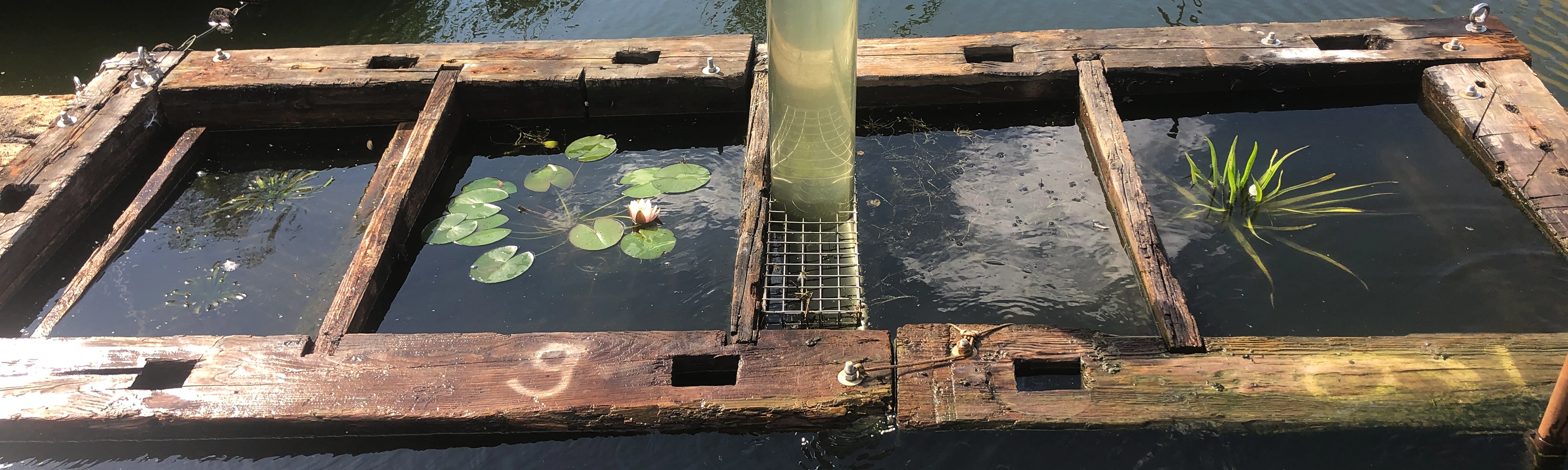 Er is van oude vloerplanken uit de Amsterdamse grachten een grote plantenbak gemaakt. Deze bak is verzwaard met een onderwaterlandschap van baksteengruis, wat goed is tegen uitspoeling van vijversubstraat, structuur geeft aan plantenwortels, en favoriet hechtoppervlak is voor (waterfilterende) mossels.